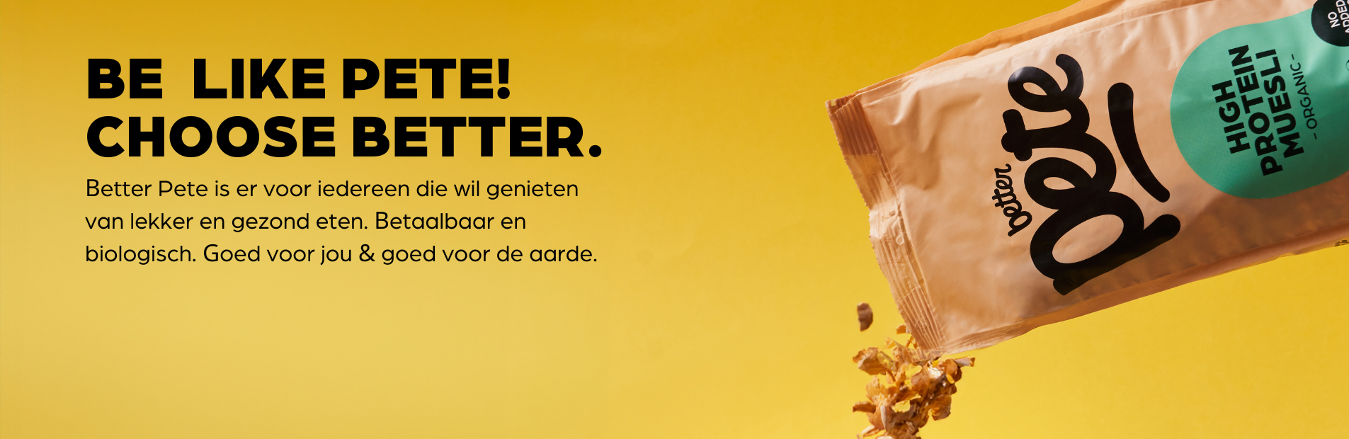 Wil jij lekker en gezond eten én goed voor de aarde zorgen, maar je niet scheel betalen aan premium producten? Dan ben je bij Better Pete aan het juiste adres! Onze producten zijn niet duurder dan de populaire A-merken. Voor hetzelfde geld koop je dus een beter product!